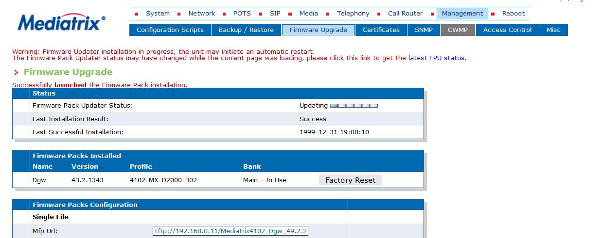 Dans le sous menu Firmware Packs Configuration, entrer l'url du chemin tftp : tftp://@IP/nom_du_fichier.bin